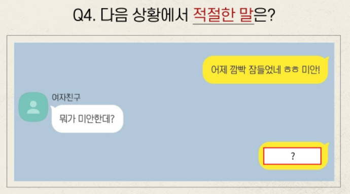 정답은 3번입니다. 잘 들어갔는지 끝까지 잠을 안자고 기다려서 여자친구가 들어갔다는 메세지를 받은 후 답을 보내고 잤어야 합니다. 먼저 마음대로 결론 내리면 큰일 납니다.